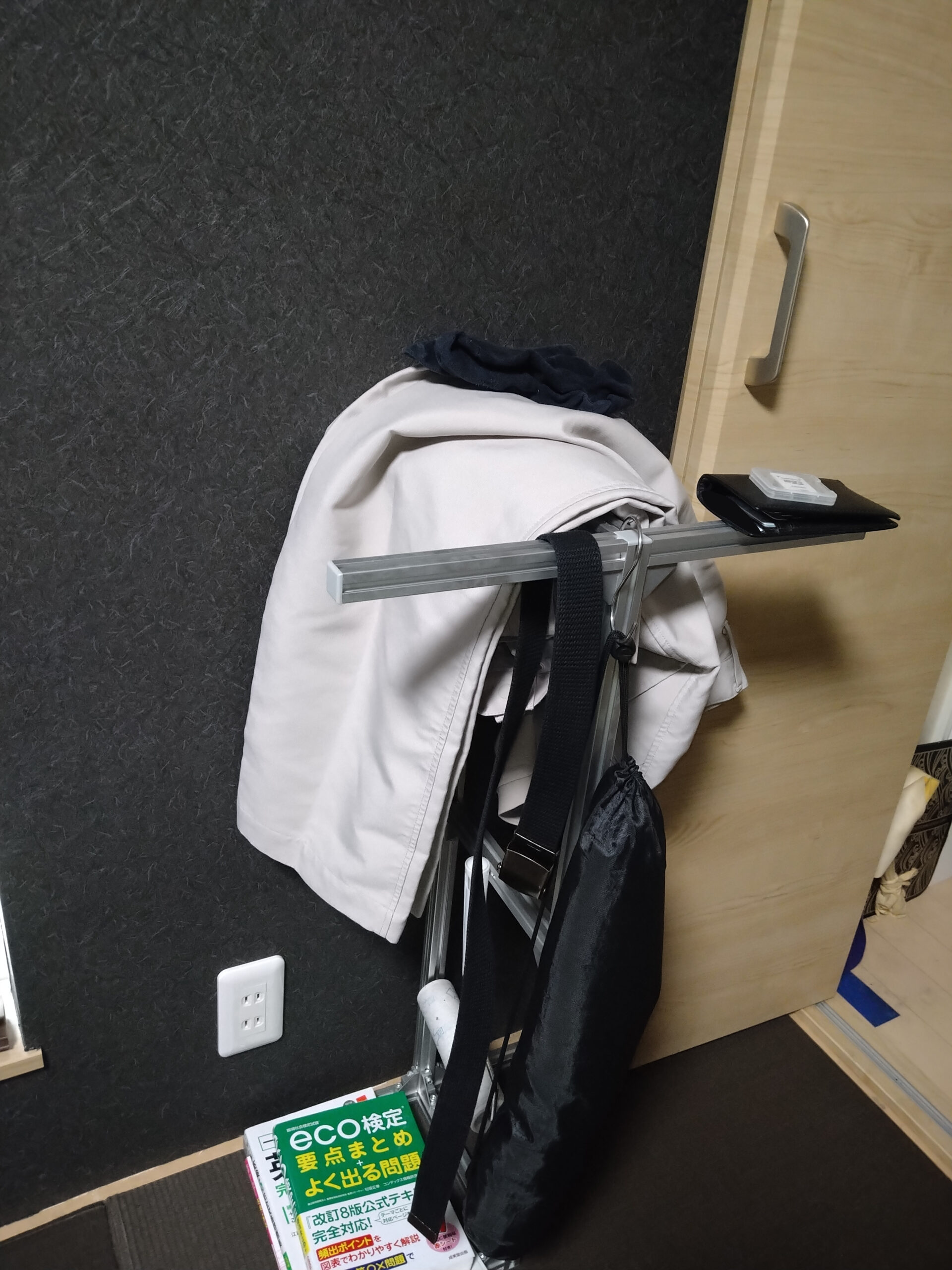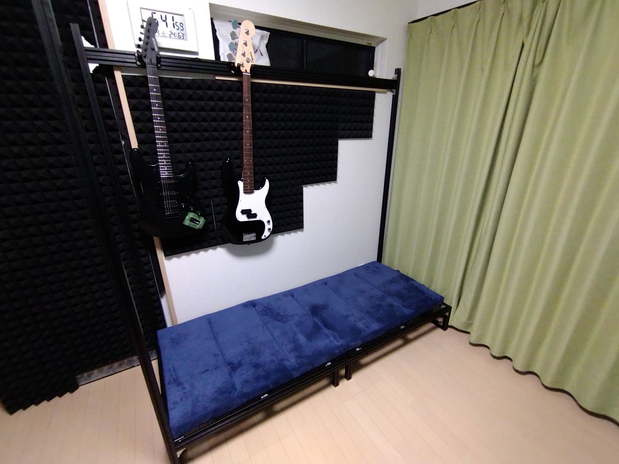 その他、ギタースタンドの代わりに自作したコンパクトベッドに楽器を引っ掛け、スペースの最大化することにしました。
