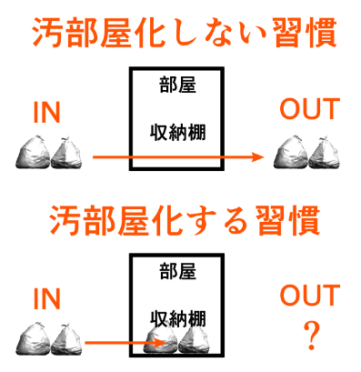 今回の状態を見るに収納場所が決まっていない、新しく増えた物の分だけ不用品を減らさずに足し算されたことが原因(段ボールやペットボトルなどがいい例)