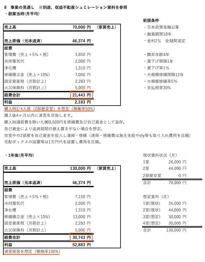 4室物件なので、1室でも空室になると稼働率がガクッと下がるので稼働率は50%までは作成した方がいいですね。