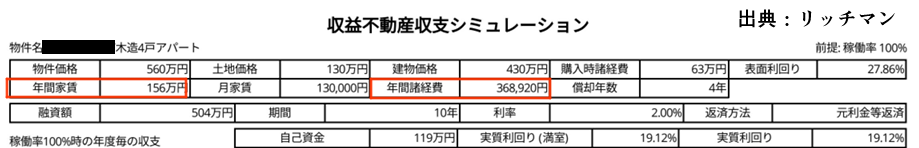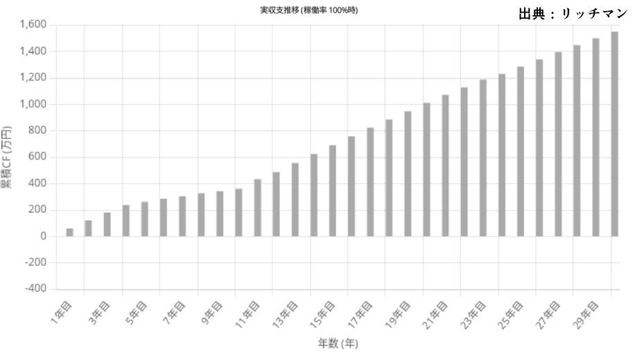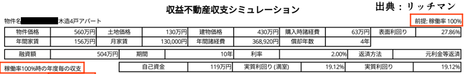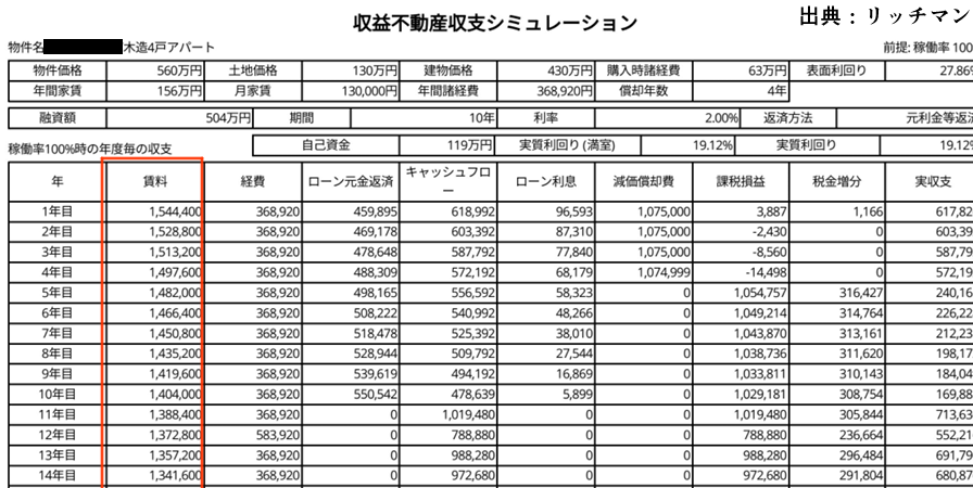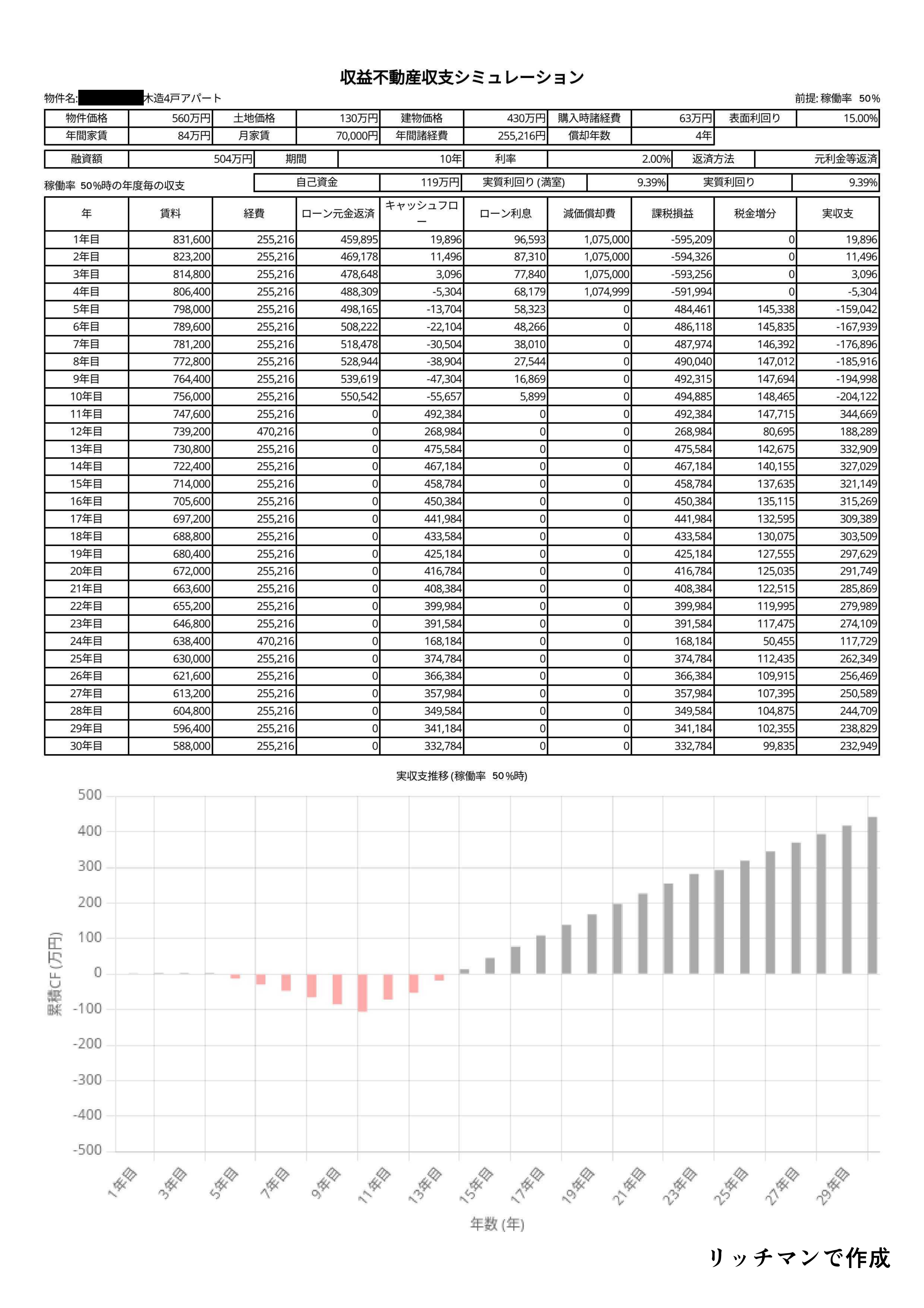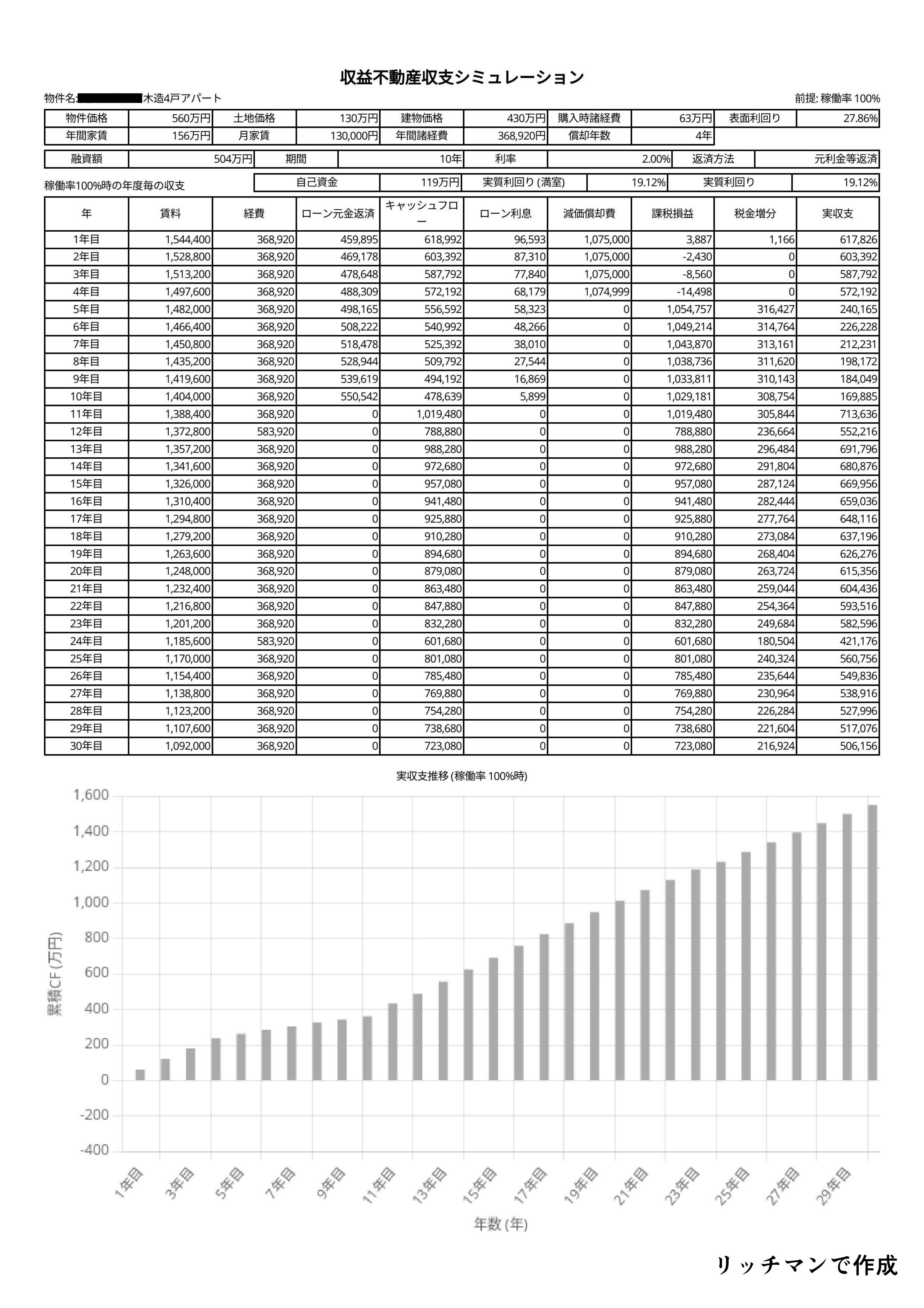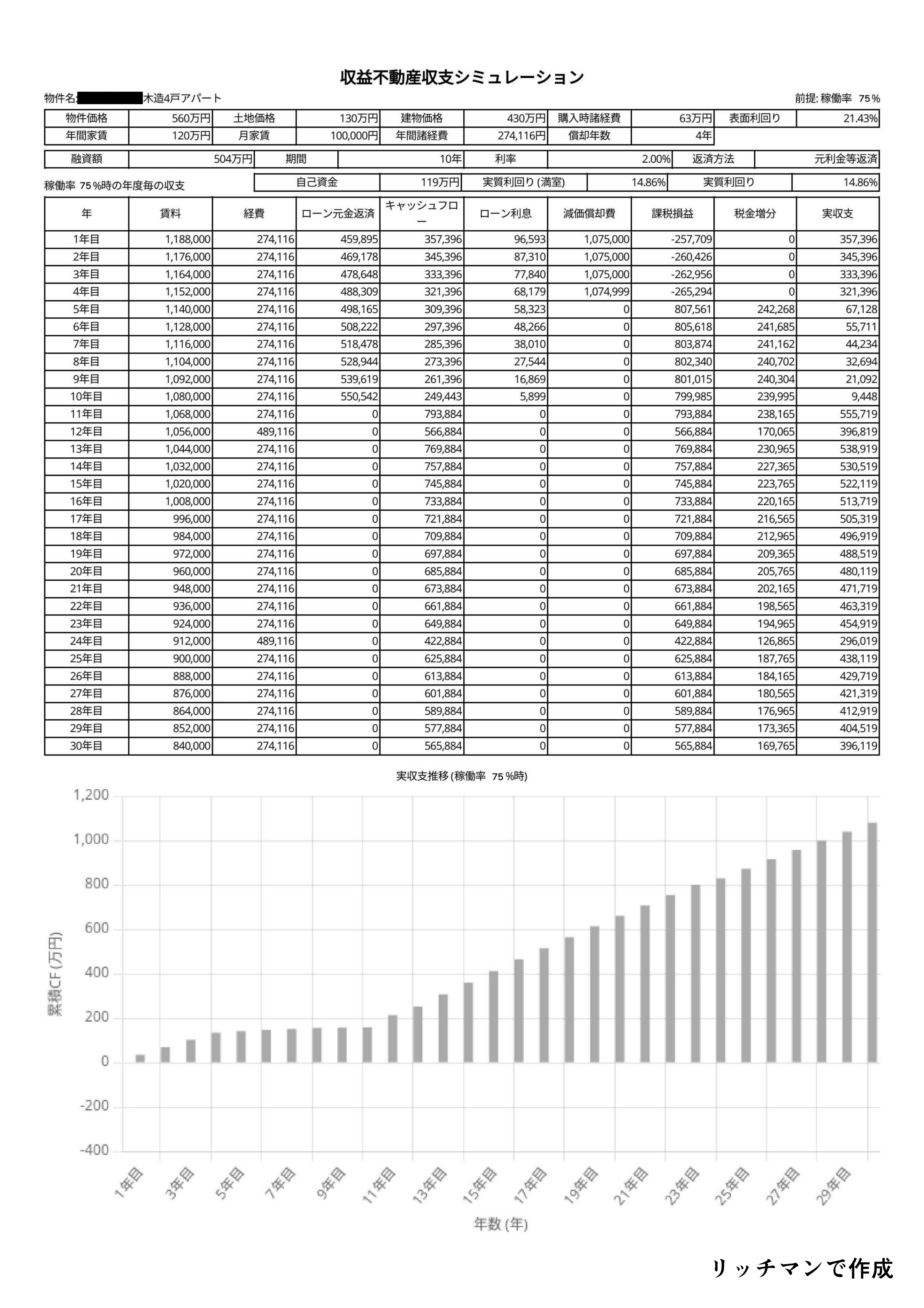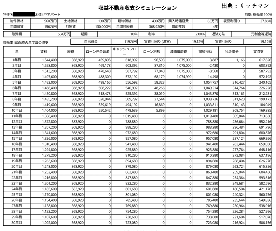 こちらはスマホアプリのリッチマンで作成してPDFに出力した収益シュミレーションです。