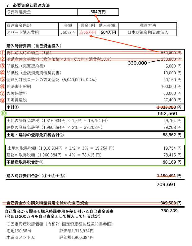 諸費用=文字通り、物件価格以外の費用なんですが、資料後半の自己資金残高を算出する際にごっちゃになってしまいました。
