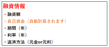 融資情報の入力 融資額・自己資金・期間・利率・返済方法