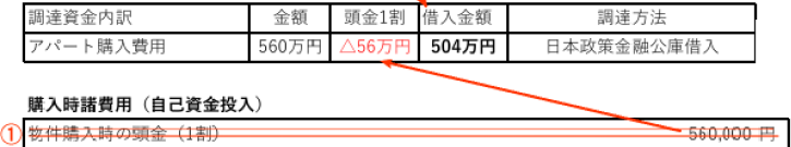 赤矢印のような表にして購入時諸費用から頭金を削除した方が分かりやすいです。