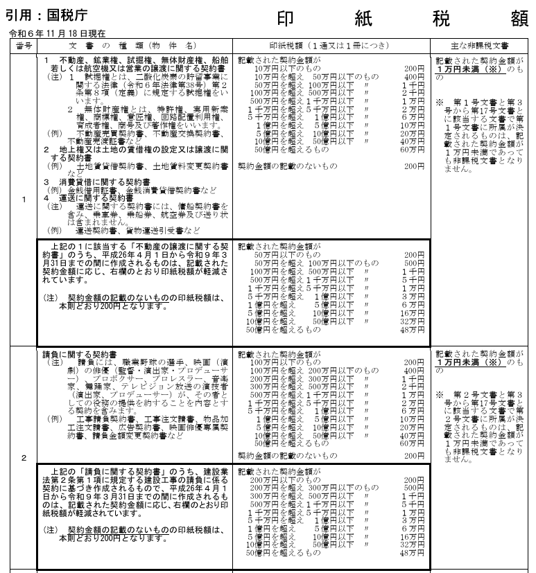 ③の不動産売買契約書と④の金銭消費貸借契約書に必要な印紙税の求め方については、国税庁が資料を公開していますが、初心者の方は不安だと思います。