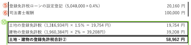 ⑤のローンの設定登記(抵当権設定)はローンの借入額×0.4%で求めるので簡単です。