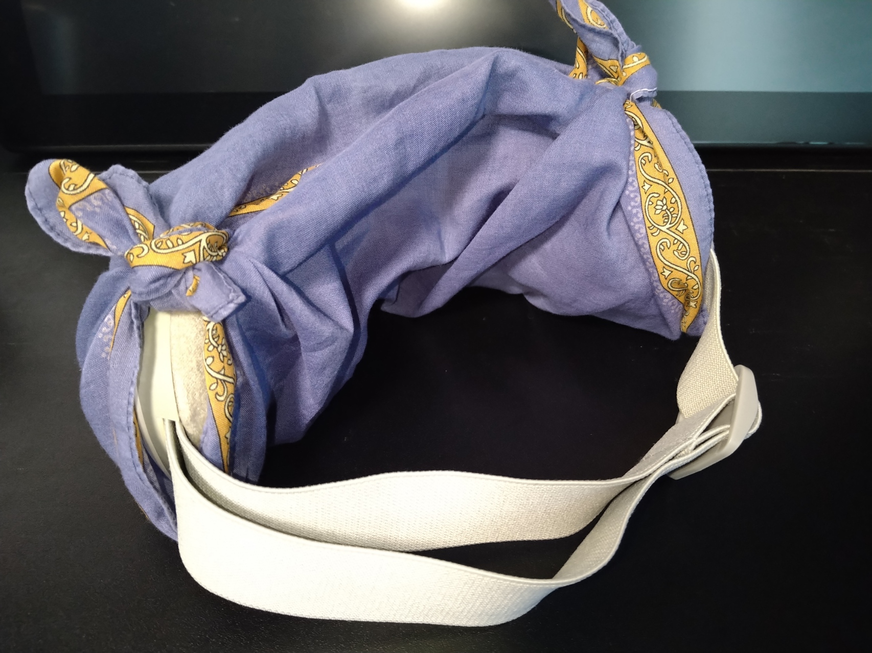 旧品は目を覆う部材が布製で、そのまま使うと乳液や皮脂汚れがついてしまうので、ハンカチの左右を縛ってカバーにしています。