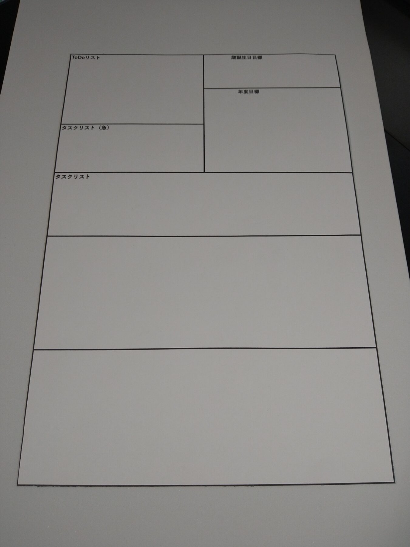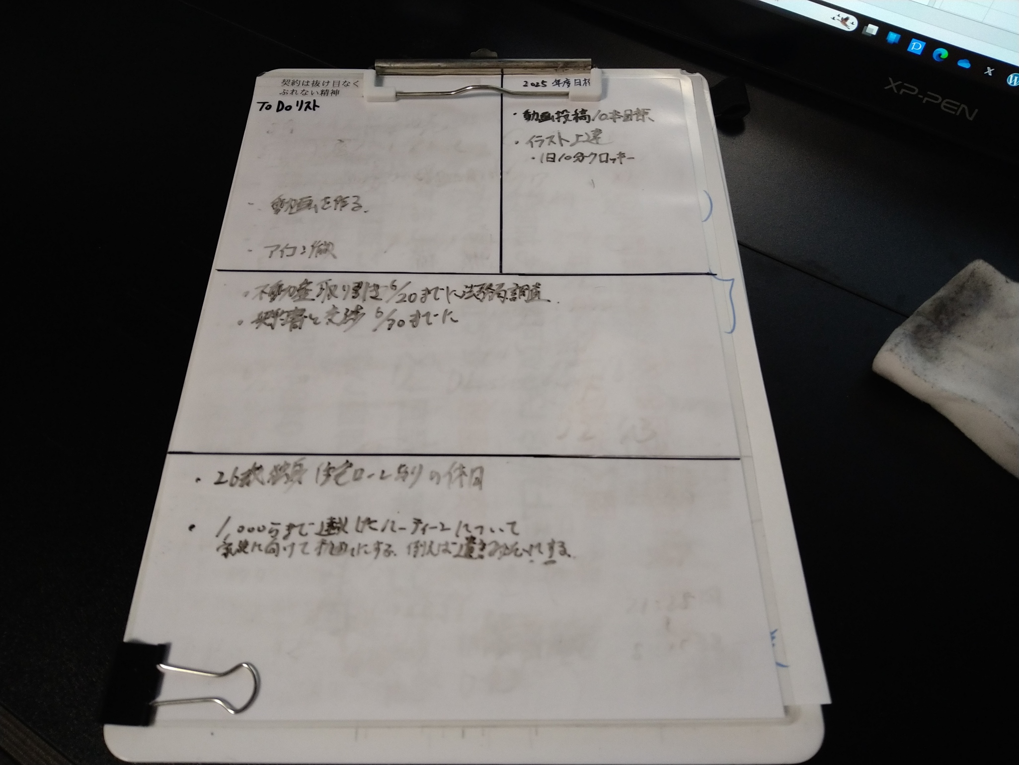 左上からToDoリスト、右側が年度目標、下の大きい欄はタスクリスト兼ブログなどを考える自由メモです。