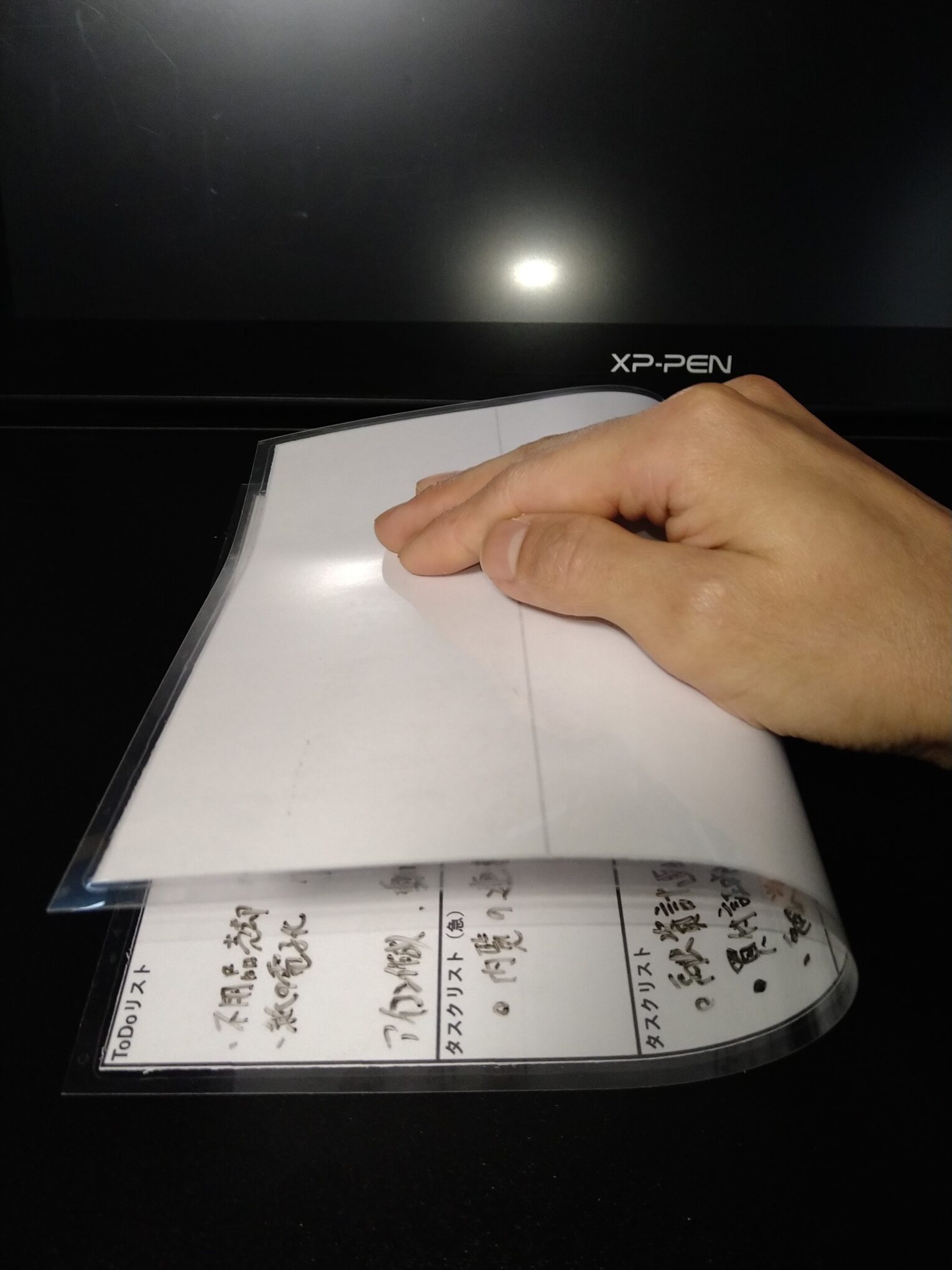 ラミネートをホワイトボードの代わりにしてデスクの横に吊るしています。